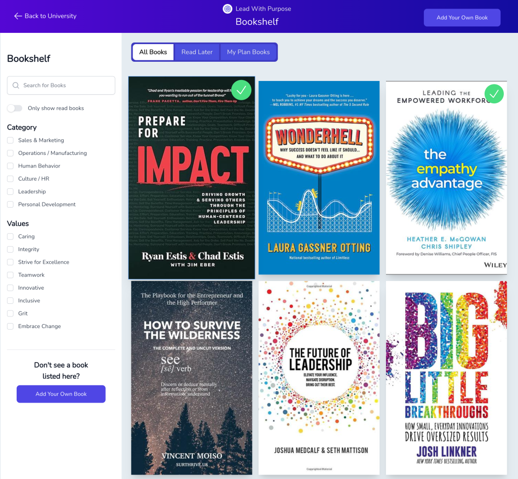 Develop leaders at every level of your organization through continuous learning initiatives. The Lead With Purpose Platform allows you to read books together as a team.